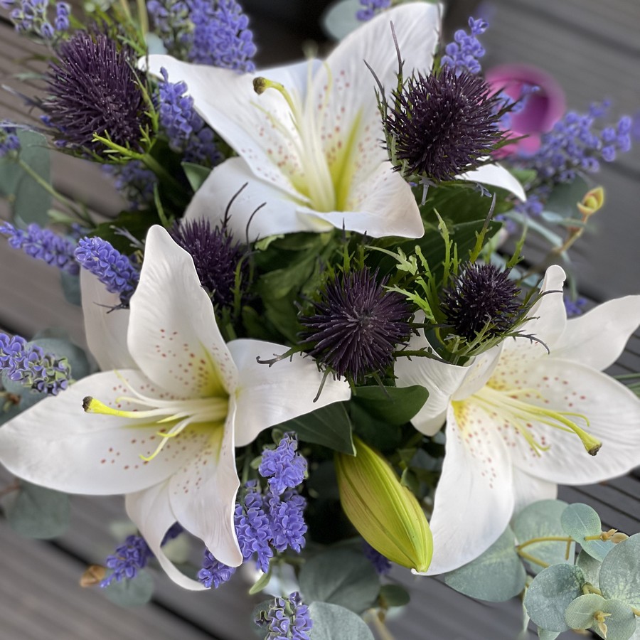 Für Ines durfte ich einen außergewöhnlich harmonischen Brautstrauß gestalten – mit einer Kombination aus weißen Seidenlilien, violetten Disteln und feinen Grünakzenten. Das Zusammenspiel dieser kühlen Farbtöne verleiht dem Strauß eine moderne, elegante Ausstrahlung, die wunderbar zu ihrem stilvollen Brautlook passte. Ein Arrangement, das durch seine klare Form und die lebendige Struktur der Disteln zugleich Natürlichkeit und Persönlichkeit ausdrückt.