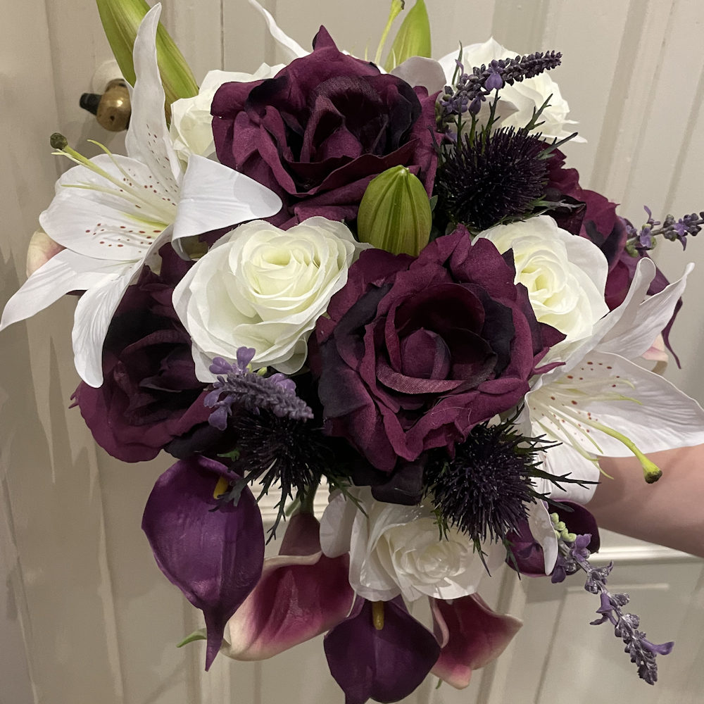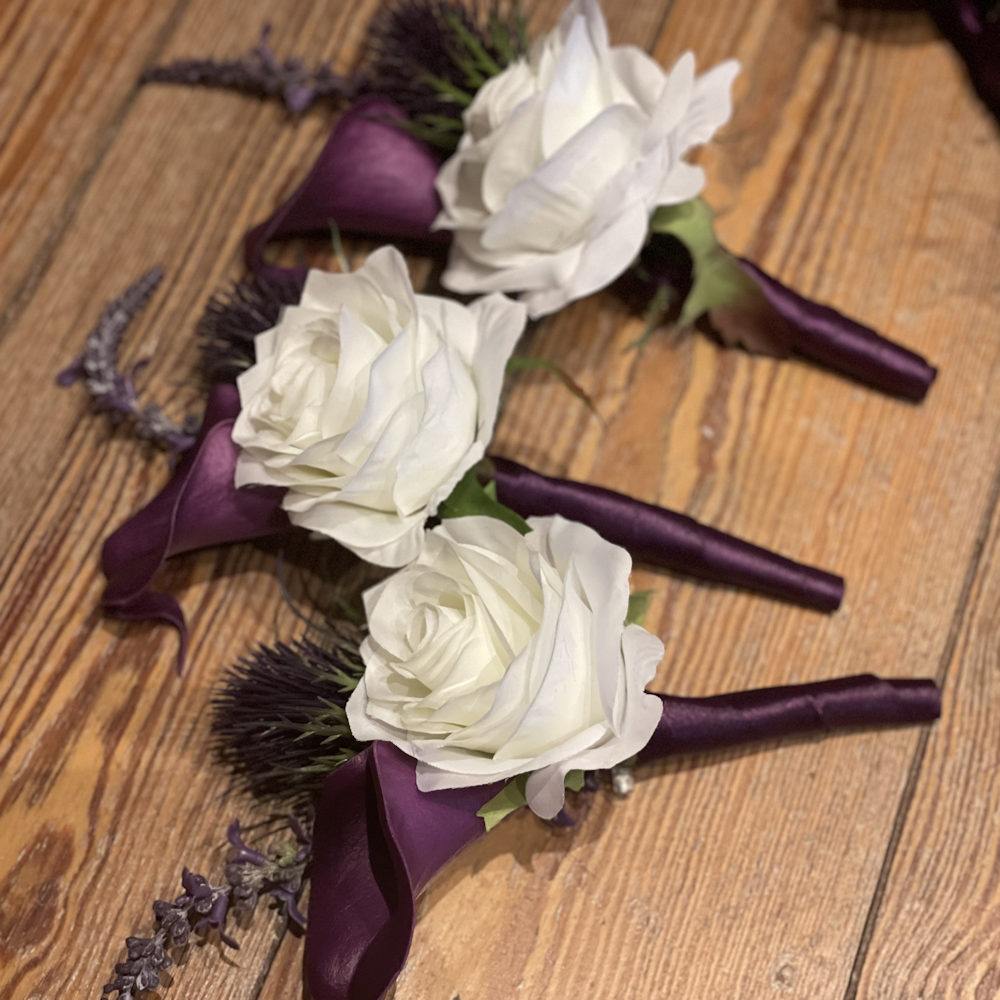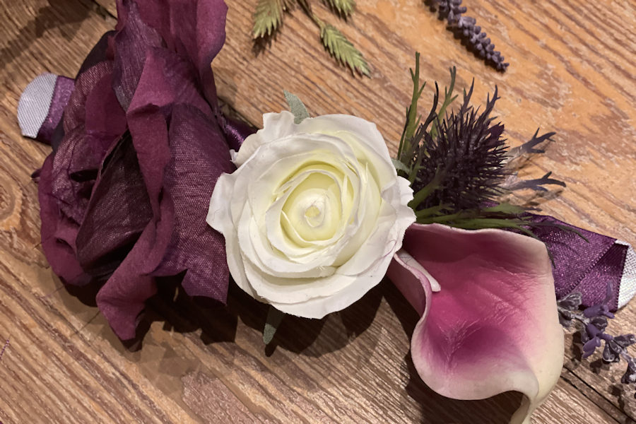 Für die liebe Katrin durfte ich ein komplettes Blumen-Set anfertigen – bestehend aus Brautstrauß, Wurfstrauß, Anstecker und Armbändern. Die Kombination aus weißen und violett-lila Seidenblüten, Lilien und zarten Grünakzenten wirkt edel und frisch zugleich. Der Strauß passte perfekt zu ihrem eleganten Brautlook und blieb den ganzen Tag über makellos – ein wunderschönes Beispiel dafür, wie natürlich Seidenblumen wirken können.