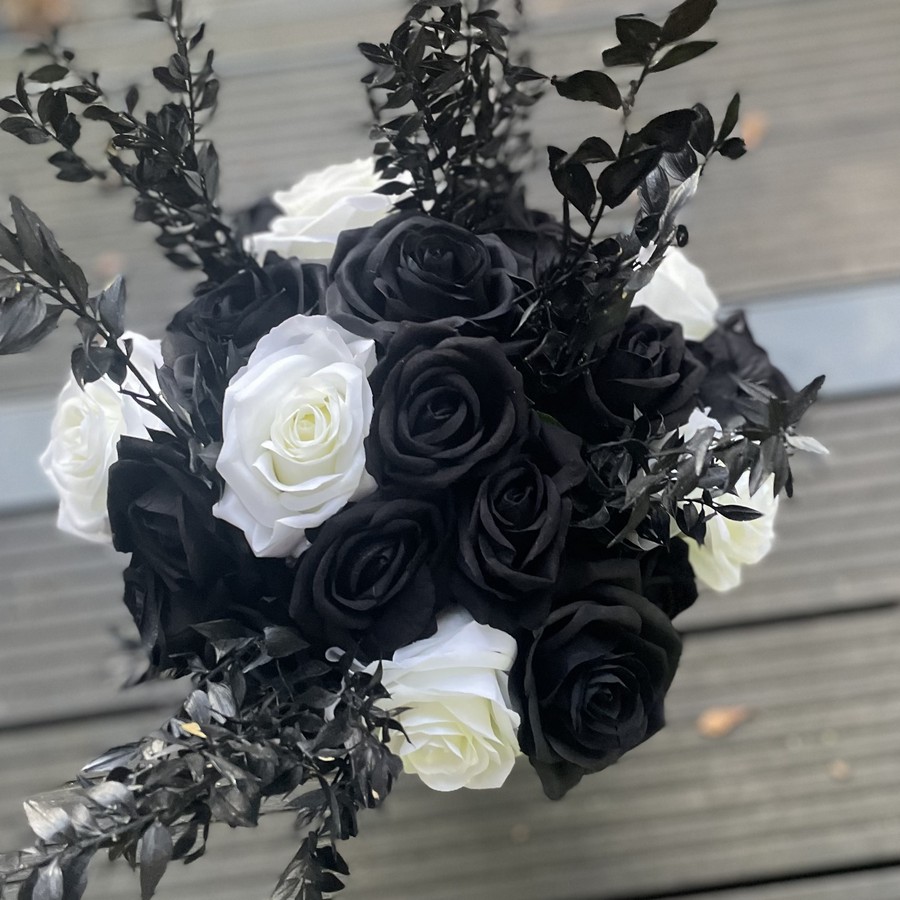 Für Gerlinde durfte ich einen außergewöhnlichen Brautstrauß gestalten – elegant, modern und mit einem Hauch Extravaganz. Die Kombination aus weißen Seidenrosen, dunklen Akzenten und feinem Grün wirkt kontrastreich und edel zugleich. Dieser Look zeigt, dass ein Brautstrauß aus Seidenblumen nicht immer klassisch sein muss – er kann auch mutig, stilvoll und absolut einzigartig sein.